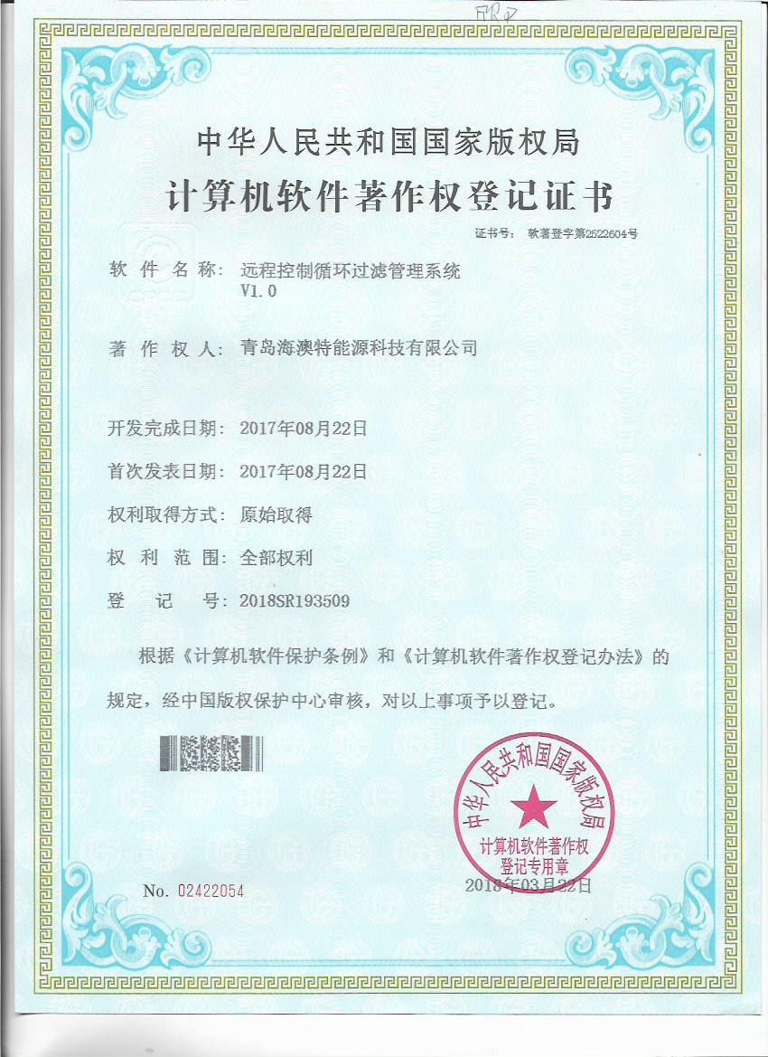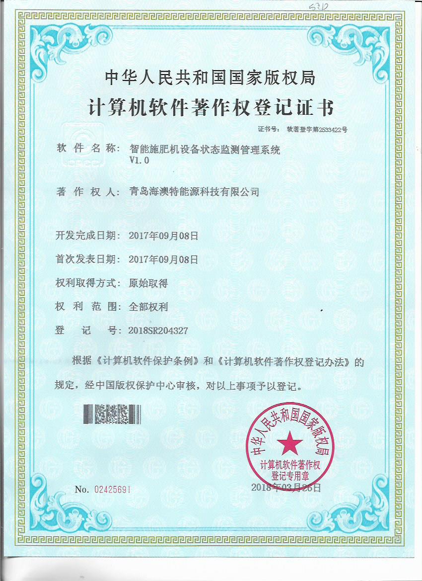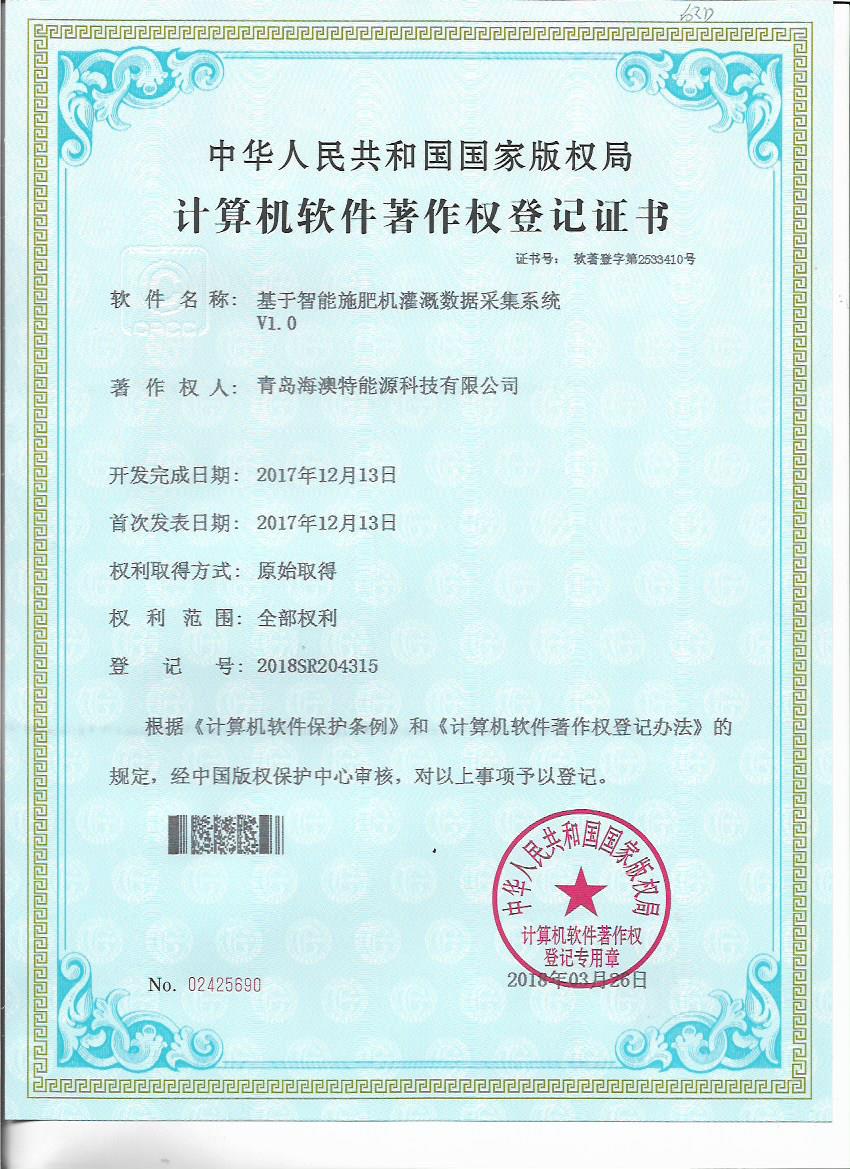 日前,青島海澳特能源科技有限公司獲得“全自動施肥灌溉遠程控製軟件V1.0”等五個計算機軟件著作權登記書。青島海澳特能源科技有限公司肩負北京新型智慧農業研究院水肥一體化研究中心有關軟件開發、智能施肥機設計等技術工作,擁有一支實力較強的研發團隊,該軟件著作權的獲得,既是對研發成果的認可,也為公司技術發展提供了保障。